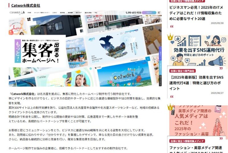 記事内では、名古屋を拠点に、単にデザインを作るだけでなく、ビジネスの目的やターゲットに応じた最適な導線設計やSEO対策を徹底し、効果的な集客を実現。ホームページ制作でお悩みの企業様に、信頼できるパートナーとしておすすめの制作会社として当社をご紹介いただきました。